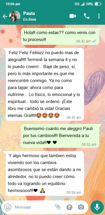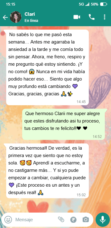 "Este curso me ayudó a escuchar mi cuerpo como nunca antes. Logré soltar esos miedos y, sobre todo, encontré la paz y el equilibrio que tanto necesitaba. ¡Ya no tengo culpa al comer!"